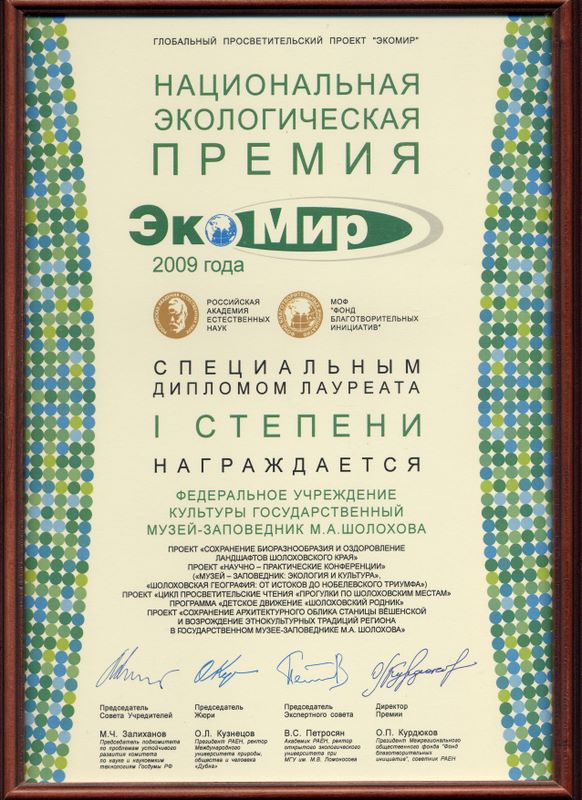 05.06.2009Музей-заповедник М.А. Шолохова стал обладателем гран-при Национальной экологической премии «ЭкоМир-2009». Он награжден специальным Дипломом I степени. Директору музея А.М. Шолохову за заслуги в развитии науки и экономики России вручен почетный знак - Серебряный крест «За заслуги». Торжественная церемония награждения состоялась 4 июня 2009 года в Государственной Думе Федерального Собрания Российской Федерации.