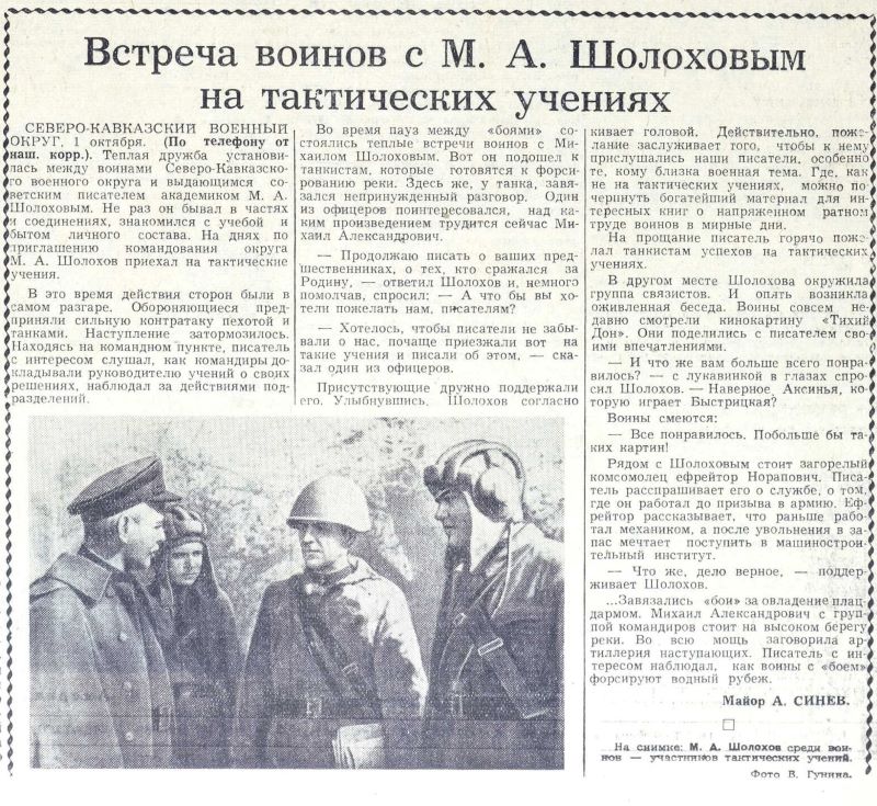 Не раз М.А. Шолохов бывал в частях и соединениях Северо-Кавказского военного округа, знакомился с учёбой и бытом личного состава. Осенью 1958 года по приглашению командования округа писатель приехал на тактические учения. Находясь на командном пункте, он с интересом наблюдал за действиями подразделений, изучал карты манёвров, слушал доклады командиров, а во время пауз между «боями» общался с бойцами и офицерами, отвечал на многочисленные вопросы.