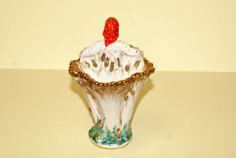 Карандашница произведена на Ломоносовском фарфоровом заводе (ЛФЗ) в 1950-х годах. Техника: роспись надглазурная, золочение. Размеры: 16,0х10,0х9,0 см. Авторы: скульптор С.Б. Велихова, художник К.Г. Косенкова.