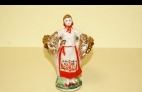 Данная карандашница представляет собой фигуру девушки в юбке красного цвета ниже колен, в фартуке белого цвета, декорированном по нижнему краю стилизованным рисунком птиц и растений, блузка белого цвета в мелкую крапинку красного и зеленого цветов, туфли красного цвета, на голове косынка красного цвета в белый горошек. Руки разведены в стороны и немного согнуты в локтях, за спиной сноп зерновых культур, оформленный в форме емкости для карандашей. Основание круглой формы зеленого цвета имитирует растительность, с вкраплением стилизованных цветов красного цвета. Отдельные детали оформлены золочением.
