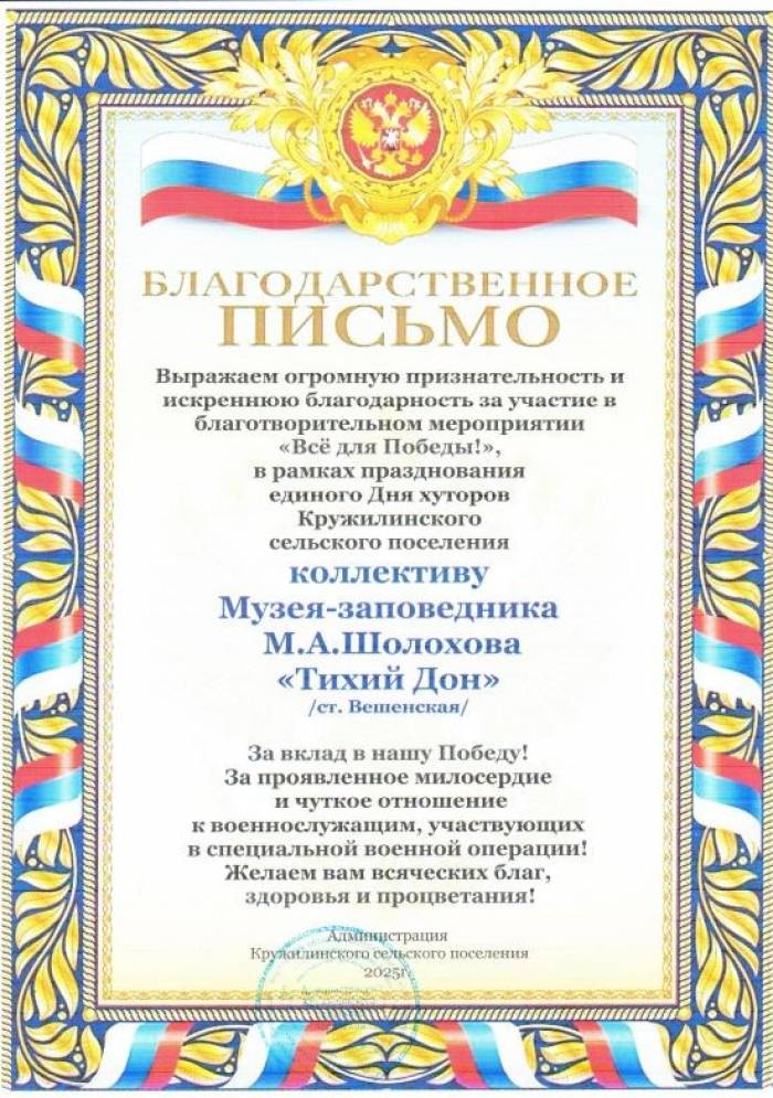 29.09.202528 сентября 2025 года Государственный музей-заповедник М.А. Шолохова «Тихий Дон» в очередной раз принял участие в благотворительном мероприятии «Всё для Победы!», которое прошло в Кружилинском СДК.