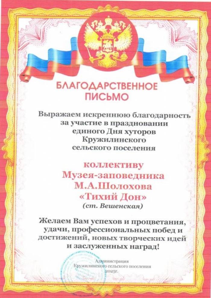Музей-заповедник М.А. Шолохова «Тихий Дон» выражает пожелания крепости духа и скорейшего возвращения домой всем защитникам.
