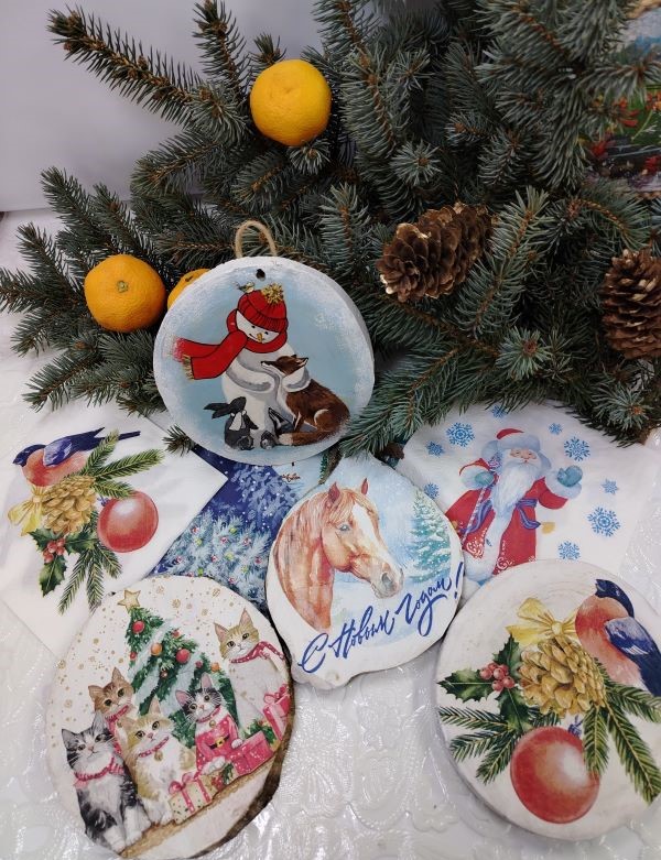 На нашем мастер-классе мы будем делать на спилах декупаж. Выполняя пошаговые действия, создать оригинальное изделие с новогодней тематикой сможет даже новичок в этом деле.