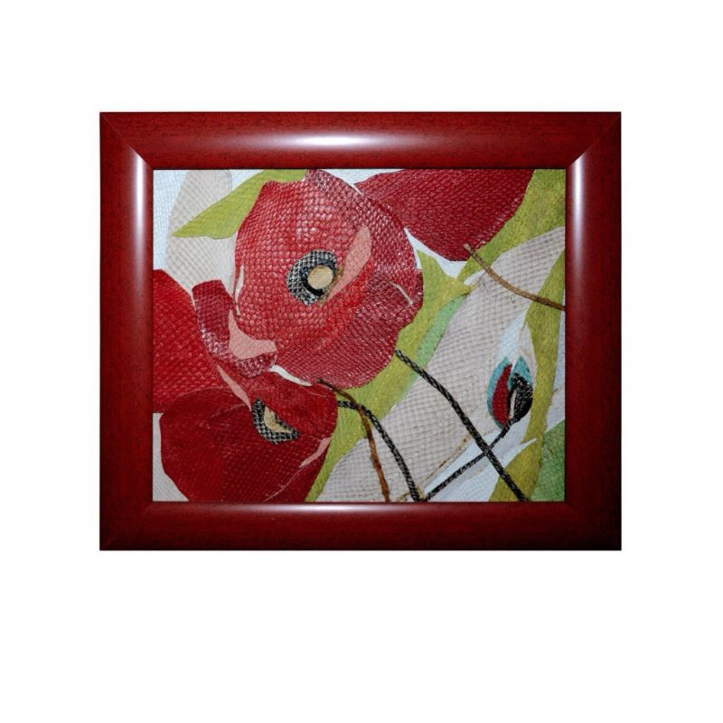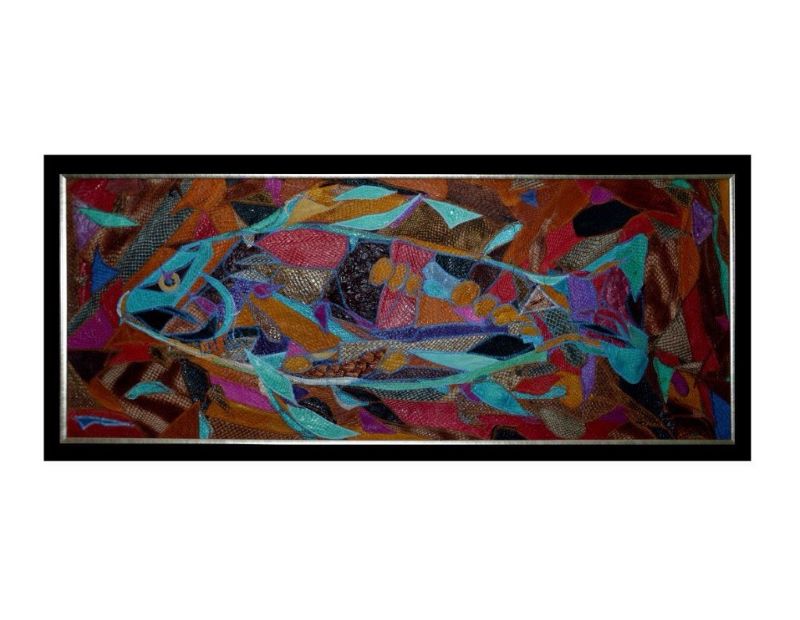 Особенность работ заключается в использовании рыбьей кожи фирмы Shadi. Этот материал, отличающийся прочностью, красотой и необычностью, стал основой для картин. Александра первой использовала его в изобразительном искусстве, расширив привычные сферы применения кожи.