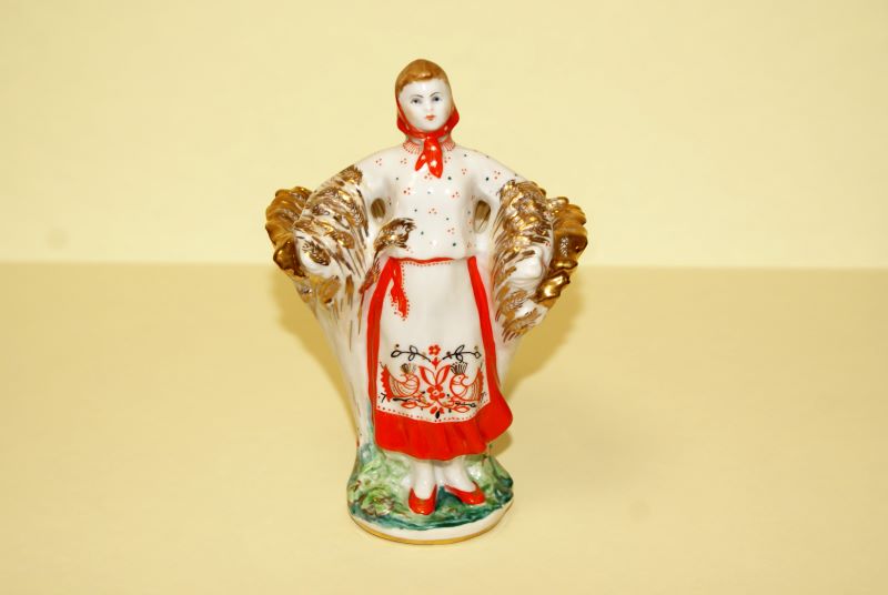 Данная карандашница представляет собой фигуру девушки в юбке красного цвета ниже колен, в фартуке белого цвета, декорированном по нижнему краю стилизованным рисунком птиц и растений, блузка белого цвета в мелкую крапинку красного и зеленого цветов, туфли красного цвета, на голове косынка красного цвета в белый горошек. Руки разведены в стороны и немного согнуты в локтях, за спиной сноп зерновых культур, оформленный в форме емкости для карандашей. Основание круглой формы зеленого цвета имитирует растительность, с вкраплением стилизованных цветов красного цвета. Отдельные детали оформлены золочением.
