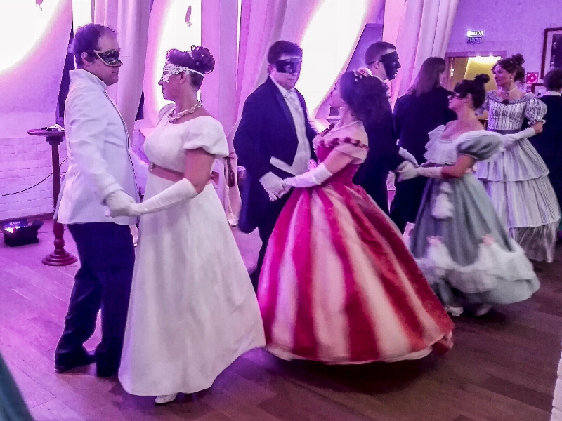 Бал-маскарад открылся полонезом. Этот танец можно назвать торжественным шествием, во время которого дамы встречают кавалеров. Затем, сменяя друг друга, звучали всеми любимые контрдансы, польки, мазурки, кадрили, вальсы, которые создали эмоционально-звуковой мир лермонтовского произведения. Особо «Польку-тройку», котильон «Шестеренки» и «Котильон на троих» танцевали по несколько раз подряд.