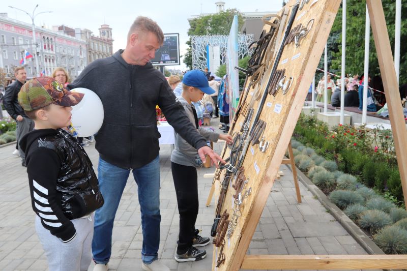 На выставке «Донские казаки – верные сыны Отечества» сотрудники музея рассказывали о славной истории Донских казаков, об их ратных подвигах. Мальчишек и их привлекла интерактивная выставка «Конная амуниция», где они подолгу рассматривали конную сбрую, подковы, стремена, удила. И взрослые, и дети с удовольствием взбирались на макет коня и делали на память фото верхом.