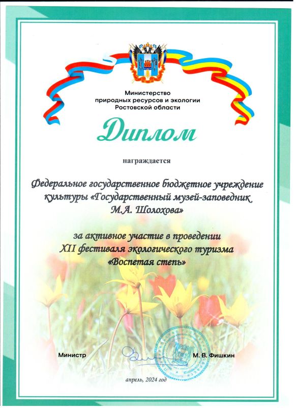 За активное участие в проведении ХII фестиваля экологического туризма «Воспетая степь» Музей-заповедник М.А.Шолохова награжден дипломом Министерства природных ресурсов и экологии Ростовской области.