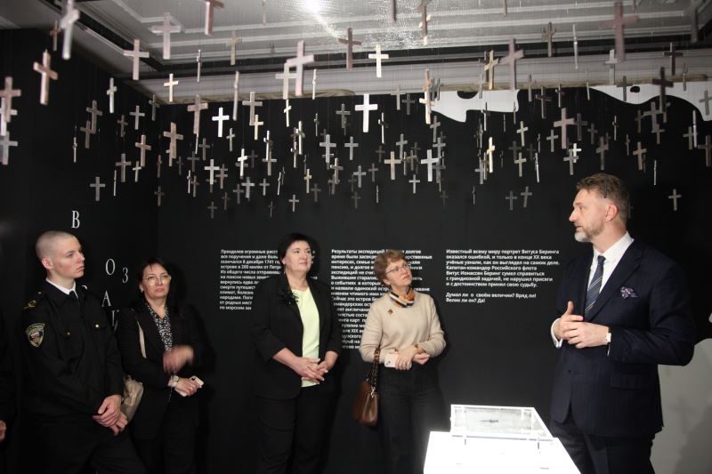 В завершение церемонии открытия выставки Виктор Алексеевич провёл познавательную экскурсию, поведав не только о жизненном пути великого мореплавателя Витуса Беринга, но и осветив богатый природный мир Дальнего Востока, уклад жизни его народов и тяжёлые испытания, выпавшие на долю первооткрывателей.