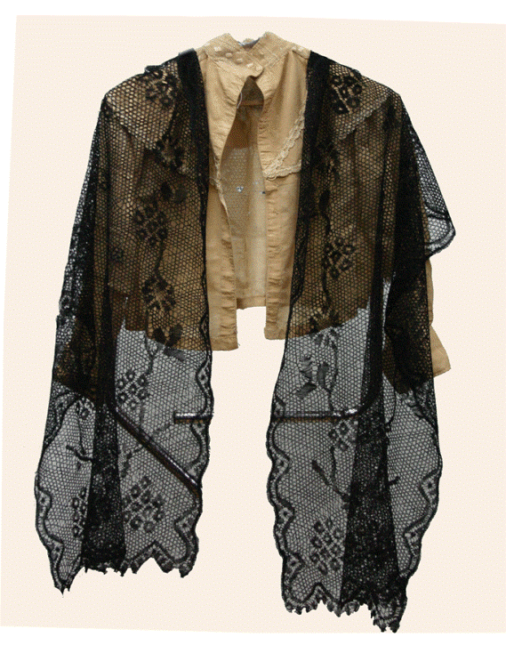 Коклюшечными косынками с длинными концами покрывали голову, а концы перебрасывали крест-накрест через плечи. Иногда один конец косынки обматывали вокруг шеи и подтыкали, а второй – свободно свисал. Так же повязывали и коклюшечный шарф.