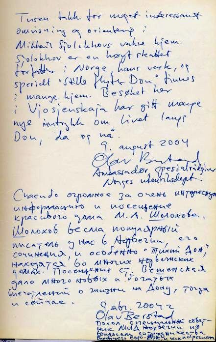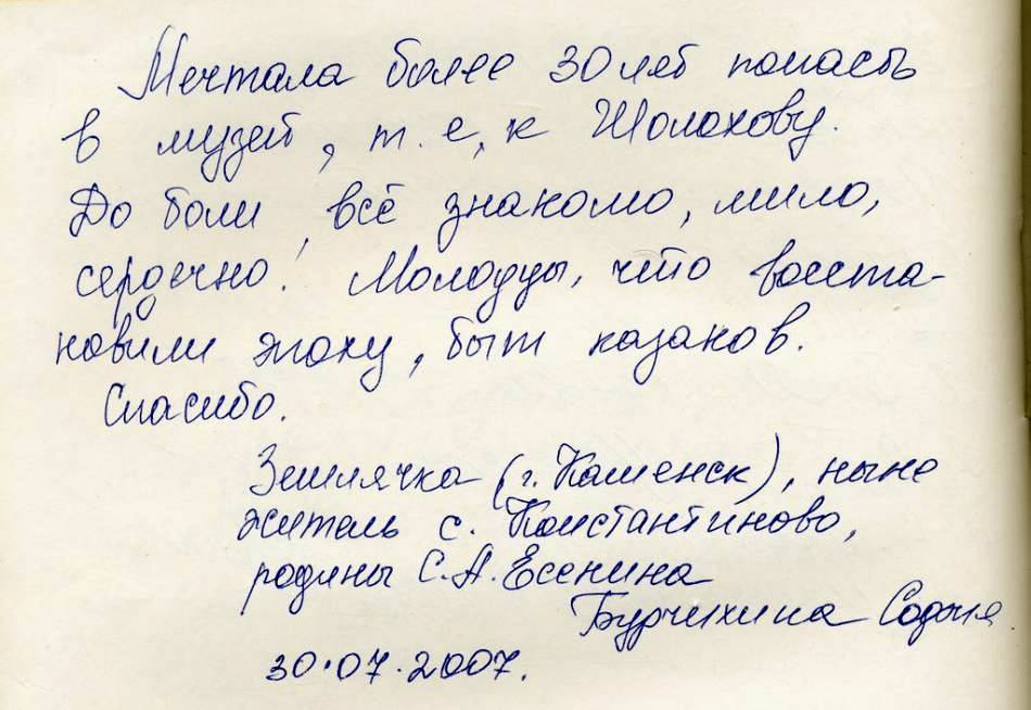 Сотни экскурсантов, посетив музей-заповедник М.А. Шолохова, оставляют свои записи в рукописной Книге отзывов. Можно также прислать отзывы и предложения по электронной почте.